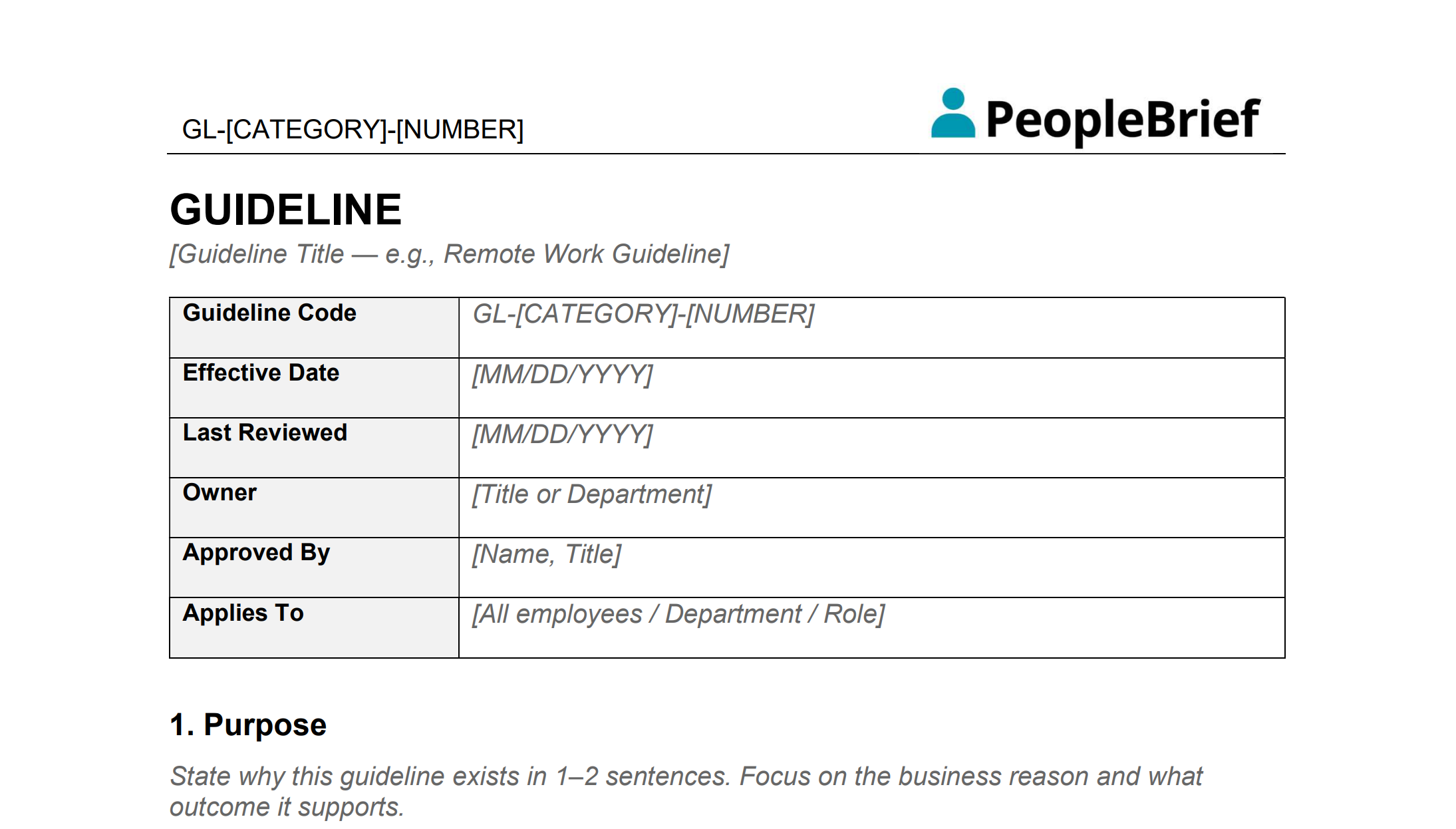 - Owner — The role or department responsible for maintaining the guideline. Use titles, not names, so ownership survives turnover.