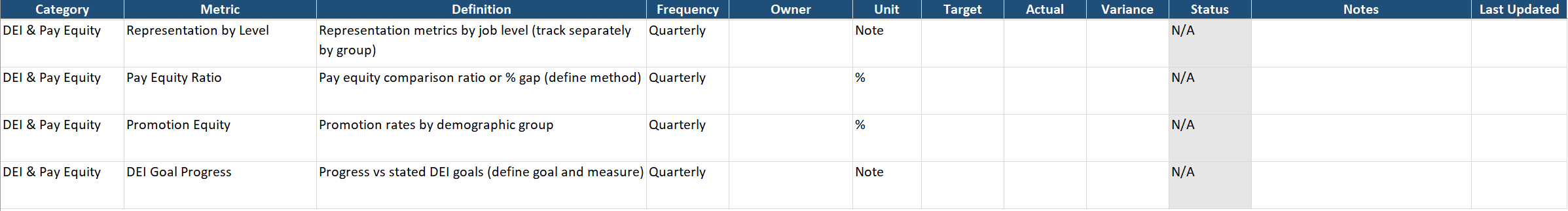 - Progress vs stated DEI goals (define goal and measure)